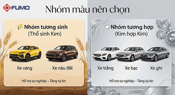 Chiếc xe thường gắn liền với hình ảnh cá nhân khi gặp gỡ đối tác, khách hàng. Một màu xe hợp mệnh như trắng, bạc hoặc vàng nhạt không chỉ giúp cân bằng phong thủy mà còn tạo ấn tượng chuyên nghiệp, đáng tin cậy. Sự tự tin trong giao tiếp và quyết định chính là yếu tố quan trọng giúp công việc hanh thông.